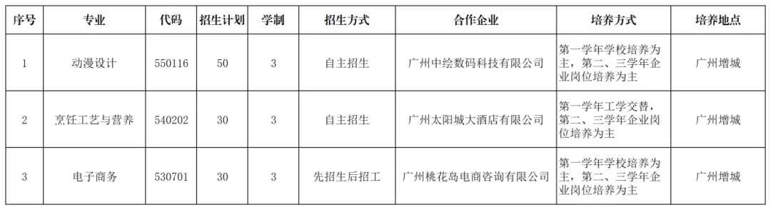 根据《广东省教育厅关于做好 2026 年省高职教育现代学徒制试点工作的通知》(粤教职函〔2026〕1 号),我校2026年现代学徒制共有3个专业点,招生计划共130人,其中试点形式为先招工后招生2个专业(招生计划80人)。符合我校毕业条件和要求的,可获得我校有关专业普通专科毕业证书。
