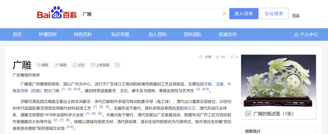 “广雕是广府雕塑的简称,指以广州为中心、流行于广东珠江三角洲的岭南传统雕刻工艺及其制品,主要包括牙雕、玉雕、木雕及核雕(榄雕)四大门类。雕刻材质涵盖象牙、玉石、硬木及乌榄核,兼具实用性与艺术性。”