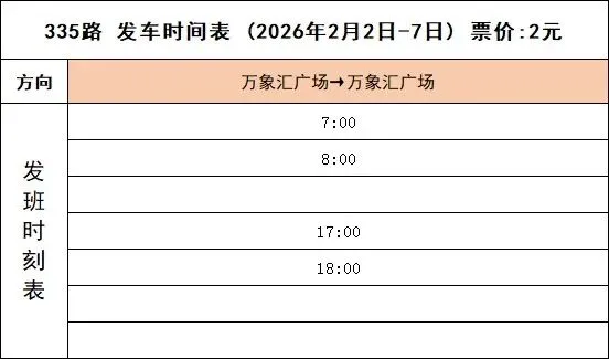 335线路计划于2026年2月2日春运开始起,万象汇广场→万象汇广场班次,营运时间调整为7:00-8:00、17:00-18:00,附上2月2日-2月7日期间发车时刻表,由此带来不便,敬请谅解。@所有人