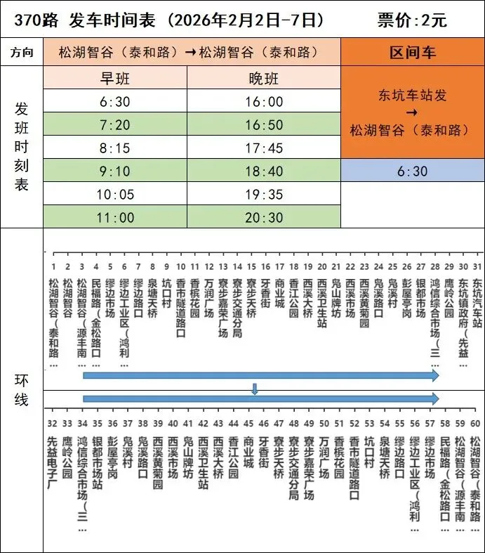 370线路计划于2026年2月2日春运开始起,松湖智谷-松湖智谷班次,营运时间调整为6:30-11:00、16:00-20:30,附上2月2日-2月7日期间发车时刻表,由此带来不便,敬请谅解。