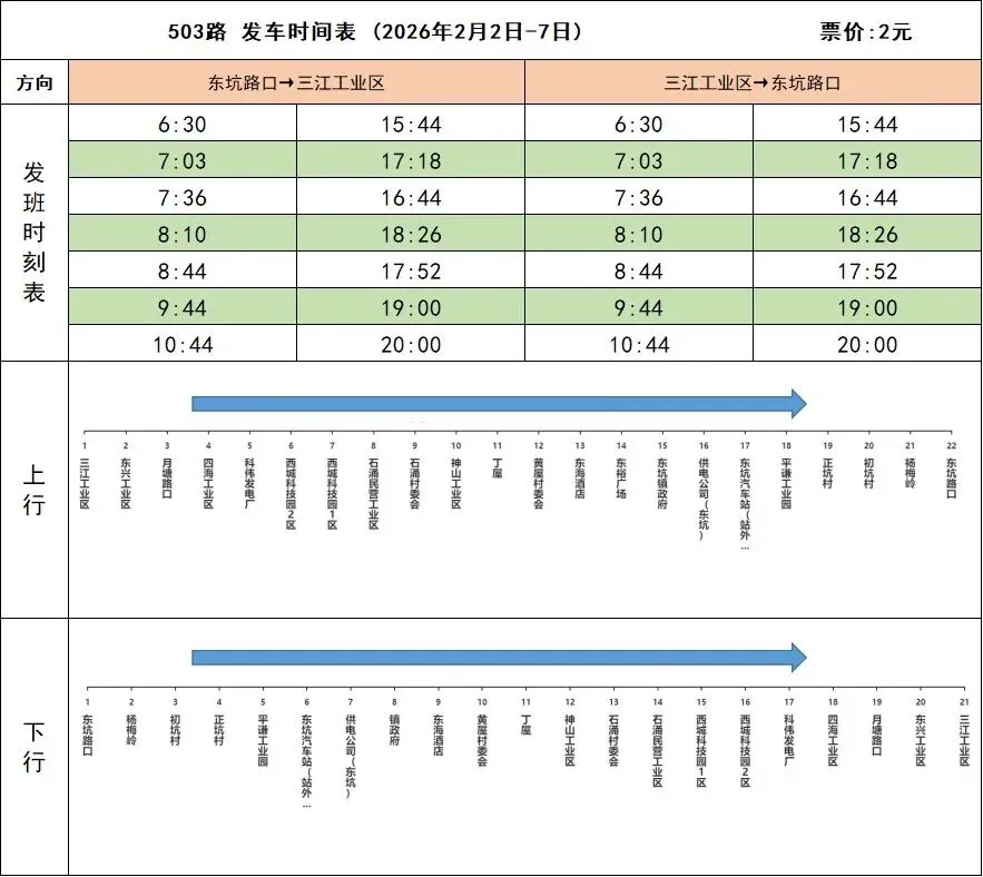503线路计划于2026年2月2日春运开始起,东坑路口-三江工业区班次,营运时间调整为6:30-20:00,附上2月2日-2月7日期间发车时刻表,由此带来不便,敬请谅解。