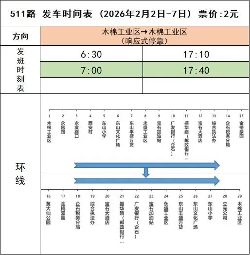 511线路计划于2026年2月2日春运开始起,木棉工业区→木棉工业区班次,营运时间调整为6:30-7:00、17:10-17:40,附上2月2日-2月7日期间发车时刻表,由此带来不便,敬请谅解。