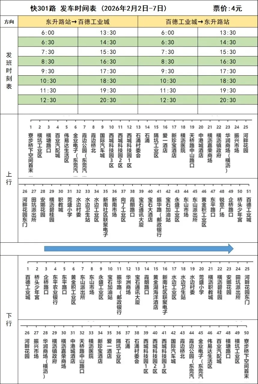 快301线路计划于2026年2月2日春运开始起,东升路站→百德工业城班次,营运时间调整为6:00-20:30,附上2月2日-2月7日期间发车时刻表,由此带来不便,敬请谅解。