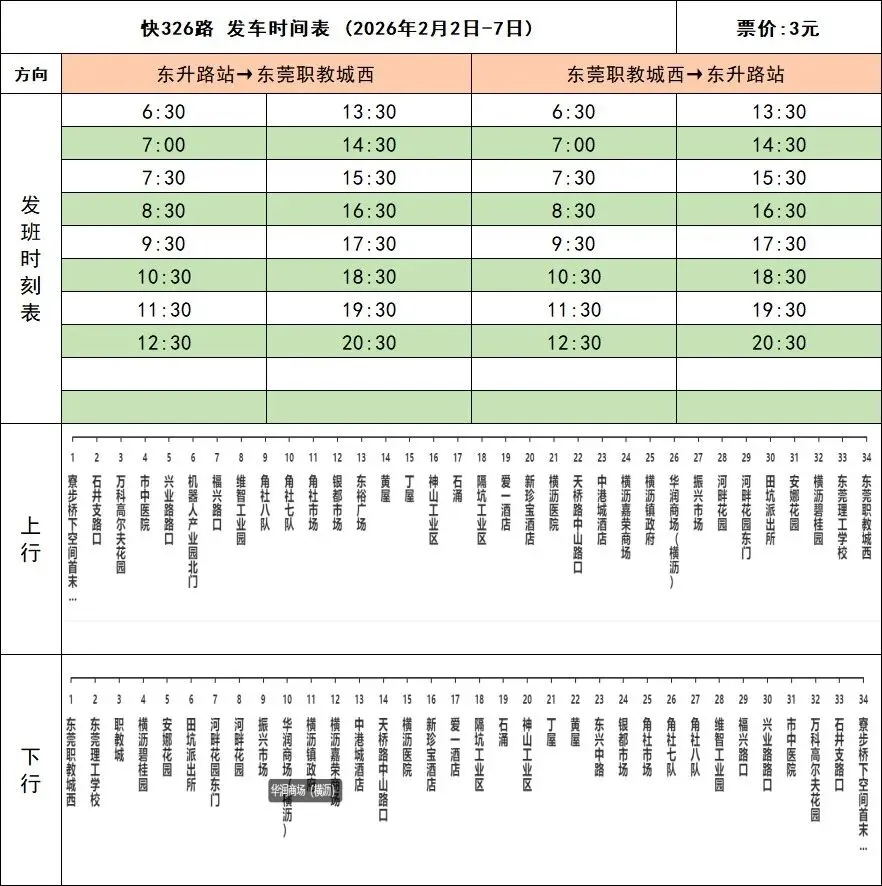快326线路计划于2026年2月2日春运开始起,东升路站→东莞职教城西班次,营运时间调整为6:30-20:30,附上2月2日-2月7日期间发车时刻表,由此带来不便,敬请谅解。