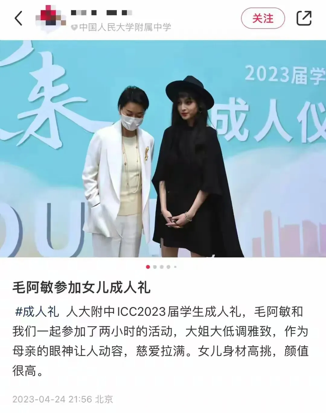 2023年4月,毛阿敏现身中国人民大学附属中学ICC 2023届学生成人礼,母女同框的画面十分养眼。