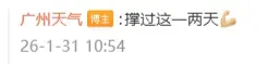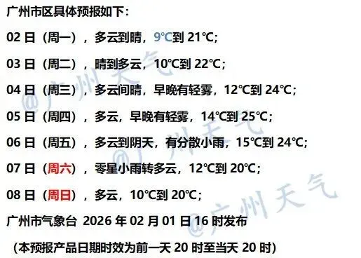 广州市气象台预计,2月1日—2日受冷空气补充影响,广州零星小雨转多云,最低气温下降至9℃左右;陆地阵风4~6级,港区和高地阵风6~8级。2月2日白天起云量减少,气温逐渐回升。