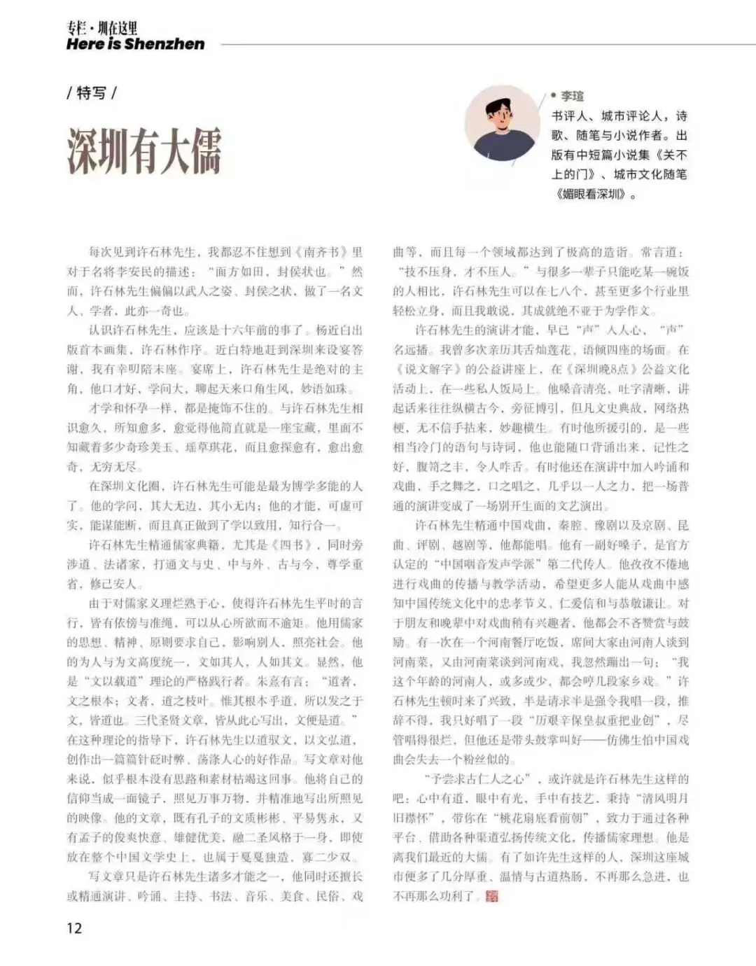 “予尝求古仁人之心”,或许就是许石林先生这样的吧:心中有道,眼中有光,手中有技艺,秉持“清风明月旧襟怀”,带你在“桃花扇底看前朝”,致力于通过各种平台、借助各种渠道弘扬传统文化,传播儒家理想。他是离我们最近的大儒。有了如许先生这样的人,深圳这座城市便多了几分厚重、温情与古道热肠,不再那么急进,也不再那么功利了。