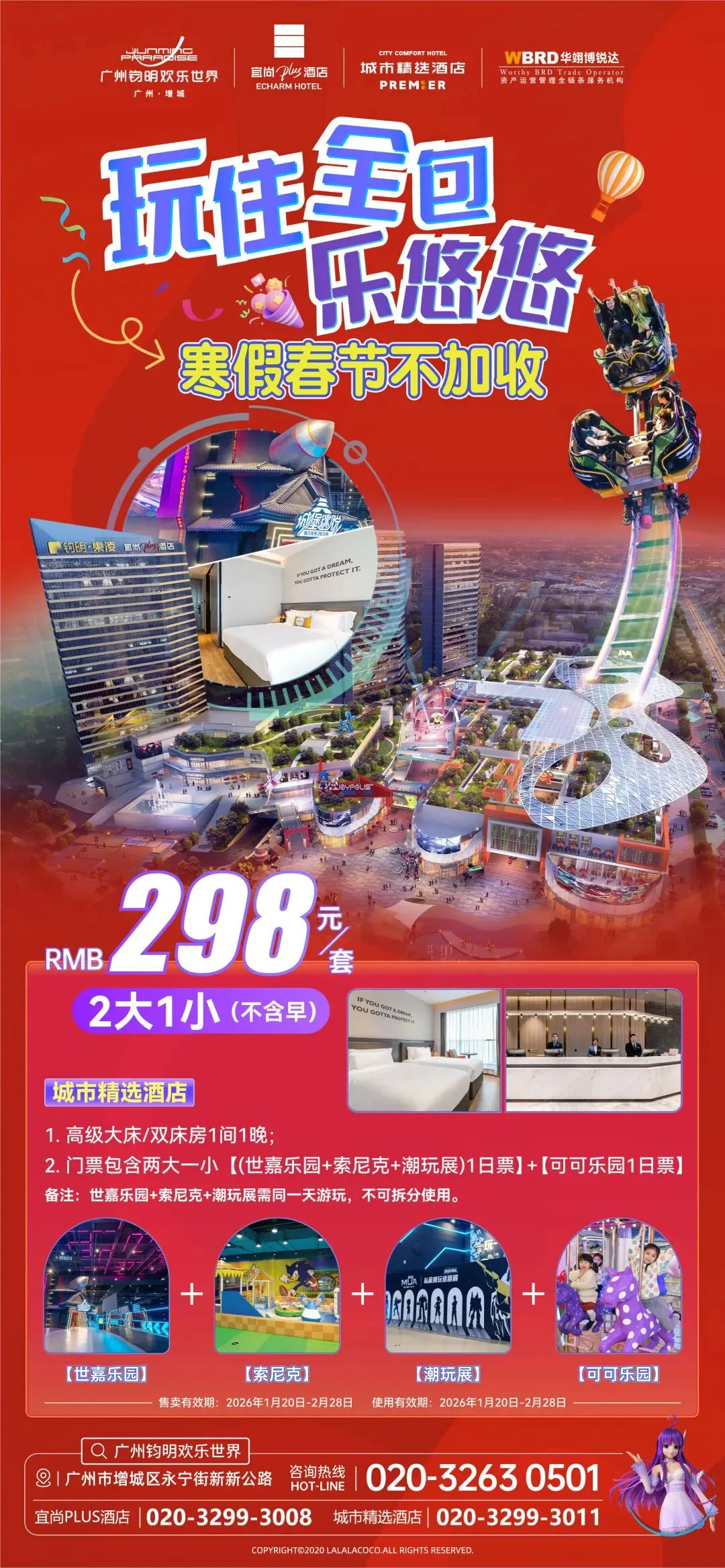 城市精选高级大/双房一间一晚2大1小(世嘉+索尼克)1日票+可可1日票