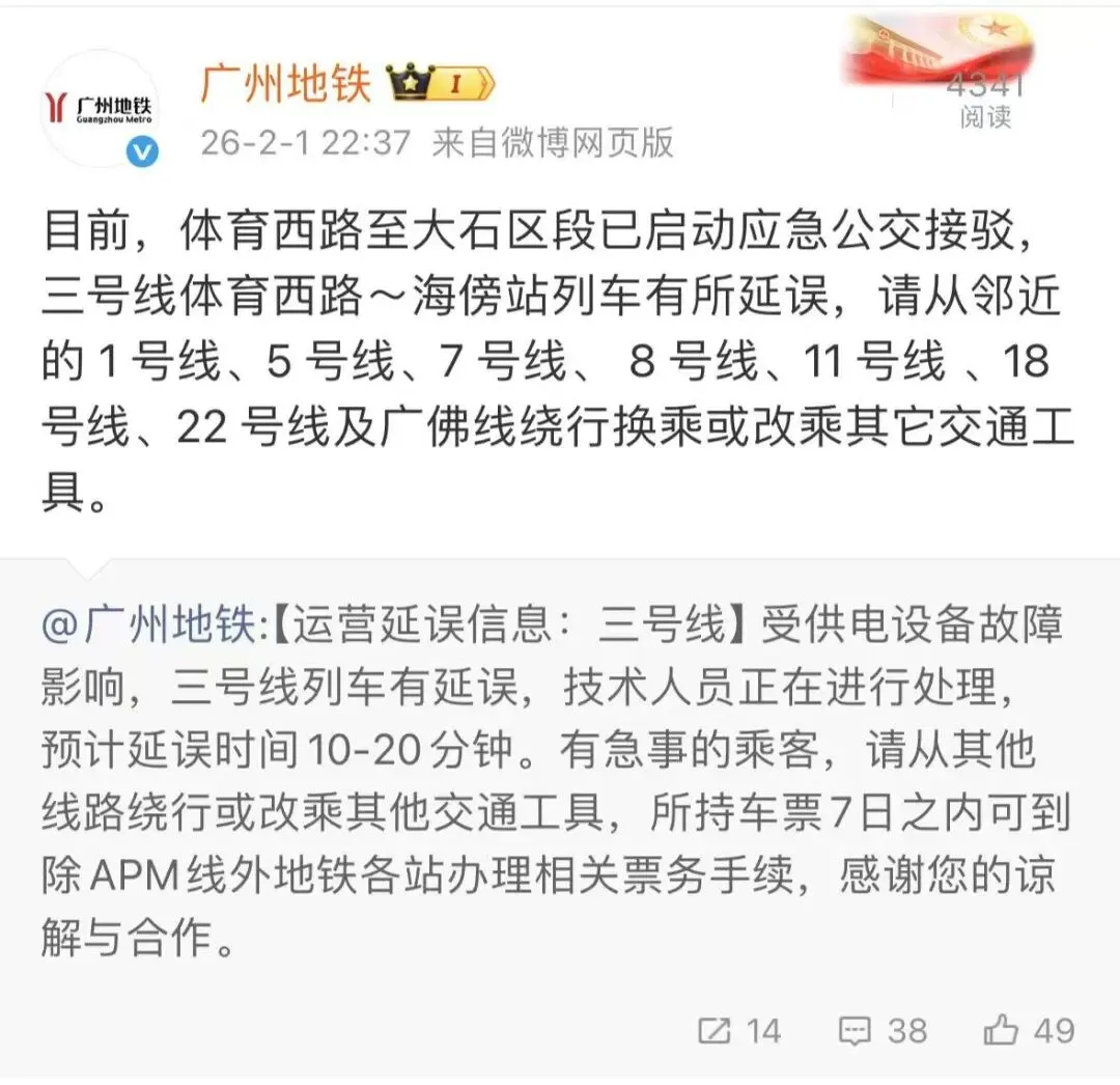 今晚(2月1日),大批网友发帖称广州地铁三号线突然停电、车厢内熄灯,引发热议。