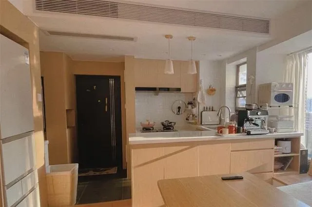 姐妹们,我去她家玩的时候打开橱柜和吊柜,里面锅碗餐具全都“隐身”收纳,门口根本没杂乱那种糟心场面,收拾起来也是分分钟。而且厨房和客厅之间啥都没堵着,那视野瞬间拉通,有种“客厅大了一圈”的错觉!