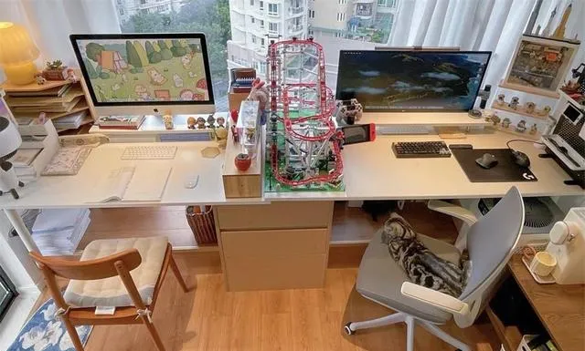 而且书桌直接放在落地窗下,双人位设计,日头一照采光和视野不要太好。哪怕家里两个大人都要居家办公,也不会抢空间和打架。冬天阳光晒进屋子,坐着码字、喝茶,那幸福指数能“咔嚓”一下就爆表了!