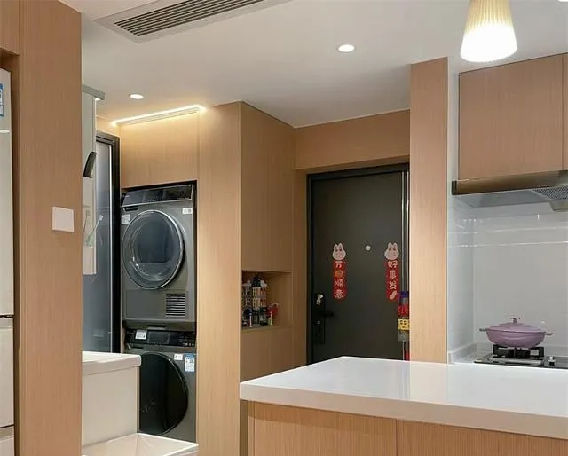 有谁和我一样,最怕洗衣机晾衣服乱糟糟?她家直接在玄关成立柜,上下嵌入洗衣机烘干机,两台叠加,丝毫不浪费空间。卫生间洗手池挪到外面,进门第一步就能关键洗手、换衣服,分区清晰,超适合有娃有猫的家庭了。我试过,确实方便不少!