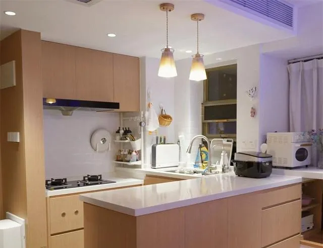 昨天我去楼下超市买菜刚进家门,看到玄关左手边就是她家的厨房,立马就被圈粉了!整个厨房是开放式U形吧台布局,还巧妙做了高低台面,洗菜炒菜不用弯腰驼背,真的太舒服~ 咱们以前不是总担心小厨房东西放不下,台面乱糟糟嘛?她直接用吧台隔断出一个小小的用餐区,收纳空间和台面一举两得,每一寸都省出花来。