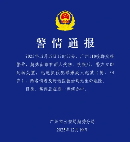 家人们,12月19日傍晚,广州越秀区发生一起伤人事件。当晚17时37分,110接到群众报警:越秀南路有两人受伤。警方闻警即动,迅速赶到现场处置,第一时间控制住局面,并很快抓获犯罪嫌疑人赵某——34岁男性。两名伤者被及时送医救治,目前均无生命危险,让大家松了口气。案件发生后,现场秩序很快恢复,警方高效反应赢得不少市民点赞。据了解,目前案件仍在进一步侦办中,更多细节有待官方披露。不管什么原因引发冲突,暴力伤人都不可取,既危害他人安全,也会让自己付出沉重法律代价。警方用行动证明:对恶性案件,他们绝不手软,发现一起、严查一起。提醒大家,遇事冷静沟通,切莫冲动动手。广州公安始终守护在我们身边,为平安保驾护航。