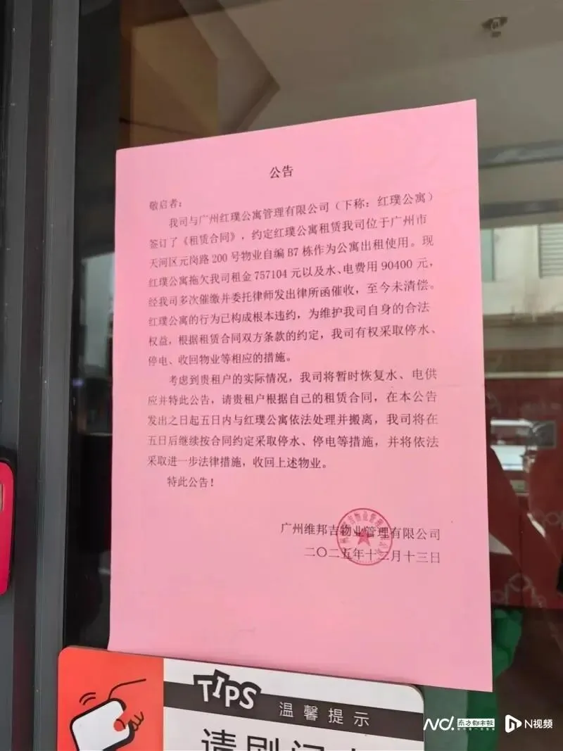 魔方公寓大石店业主于1月15日贴出的通知显示,公寓业主方与红璞公寓签订租期至2029年4月19日止,现因红璞公寓拖欠该房屋2025年7月至12月租金超60万元,出租方有权采取停水停电措施并收回该房屋。