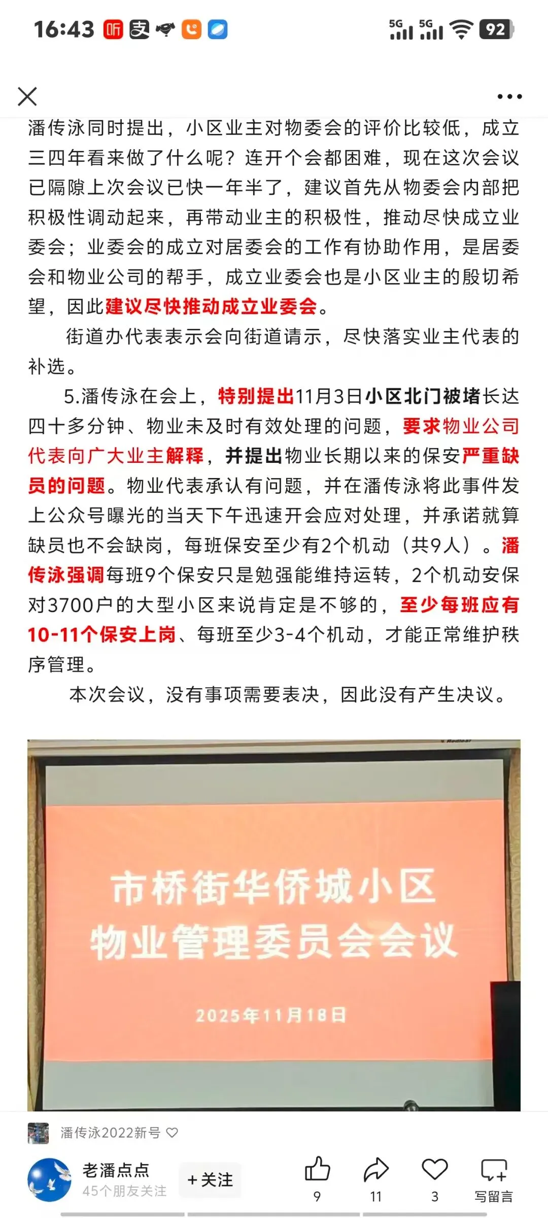 据公众号“老潘点点”介绍,2025年11月18日,广州市番禺区华侨城小区物委(管)会召开会议,共8位委员出席,居委会书记等也参加了会议。物管会开次会有什么特殊的吗,是特殊,因为此次会议距上次已时隔十六个月之久。