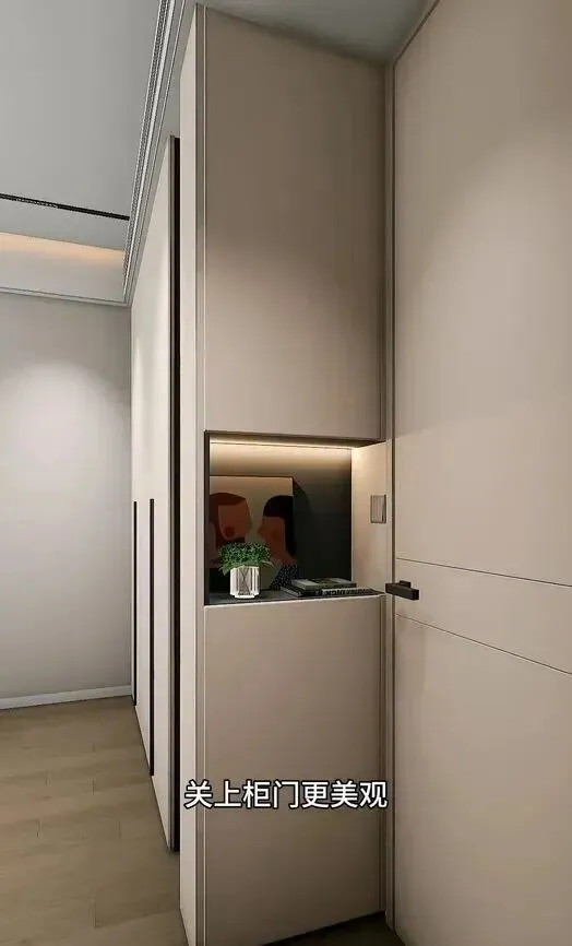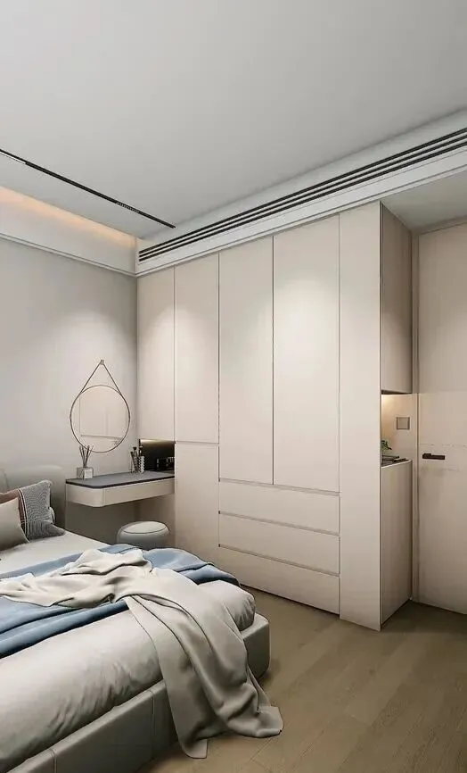 其实广州这边流行的一种做法,明显更聪明,顶柜直接省掉,柜子做到正常高度,预留一点空间,天花板和柜顶隔着一条缝,直接拿来放香薰啊小绿植,或者装个隐藏灯带,氛围感一下就来了,整面墙瞬间不压抑了好多,房间亮堂干净,看着舒服,收纳反而用得顺手多了。