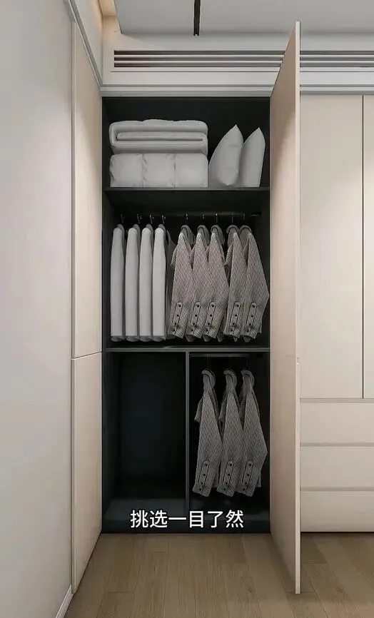 有个广州朋友家,喜欢收纳,干脆做了开放格,把出门常带的包挂上去,下班回来直接一扔,比在顶柜翻箱倒柜强多了,平时整理也方便,清爽又有家的味道,其实家里东西真没那么多,衣服断舍离一波,柜子根本不怕装不下,用起来比顶柜利索多了。