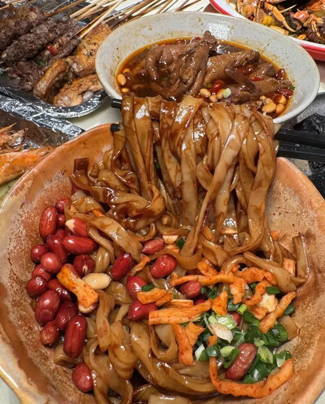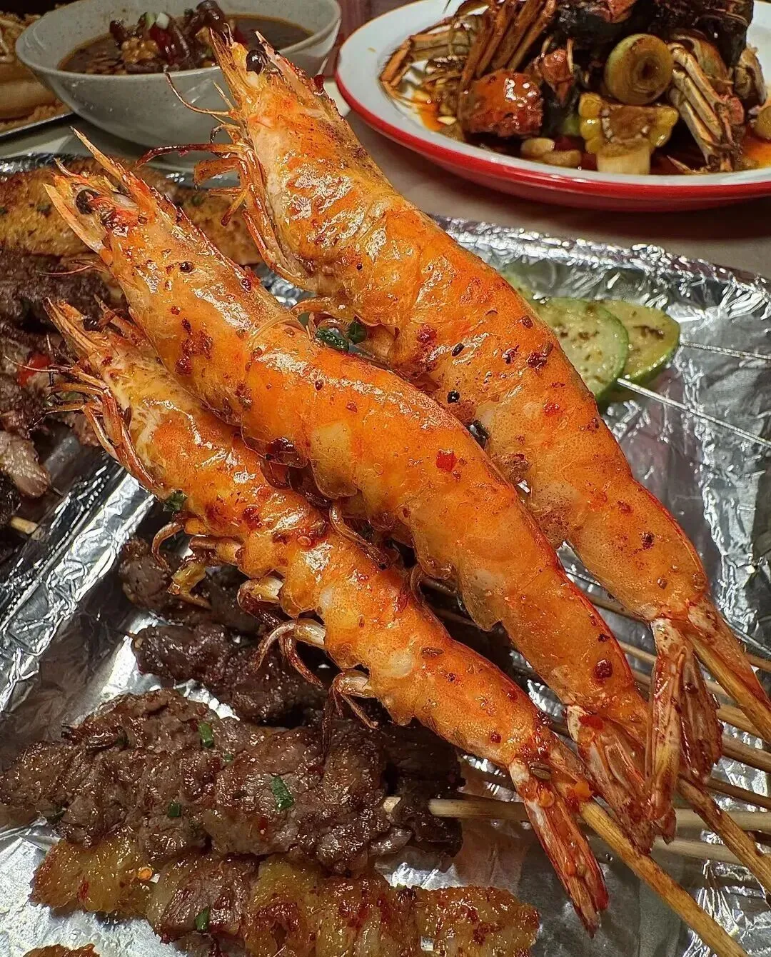 牛板腱、彩椒牛肉、五花肉、羊肉串 , 撒上辣椒面往碳火上一放 , 滋滋冒油 , 那个香味飘过来 , 饿不饿的都想吃。 油脂在嘴里爆开的感觉 , 焦脆甘香 , 真的毫无抵抗力。