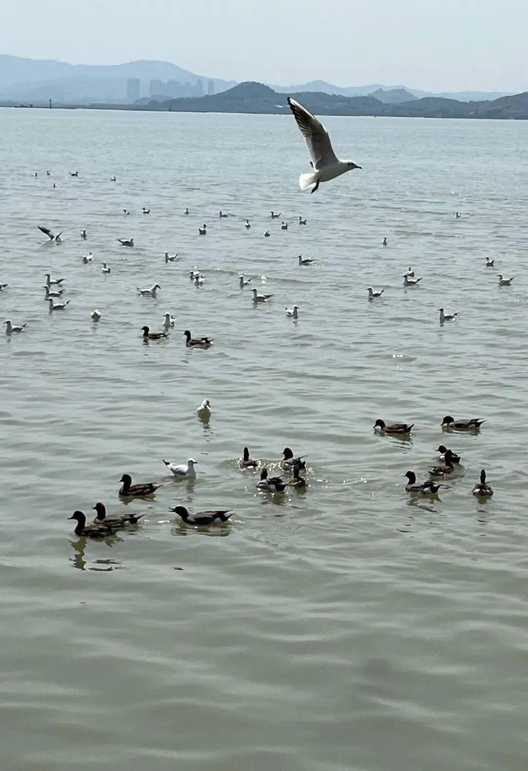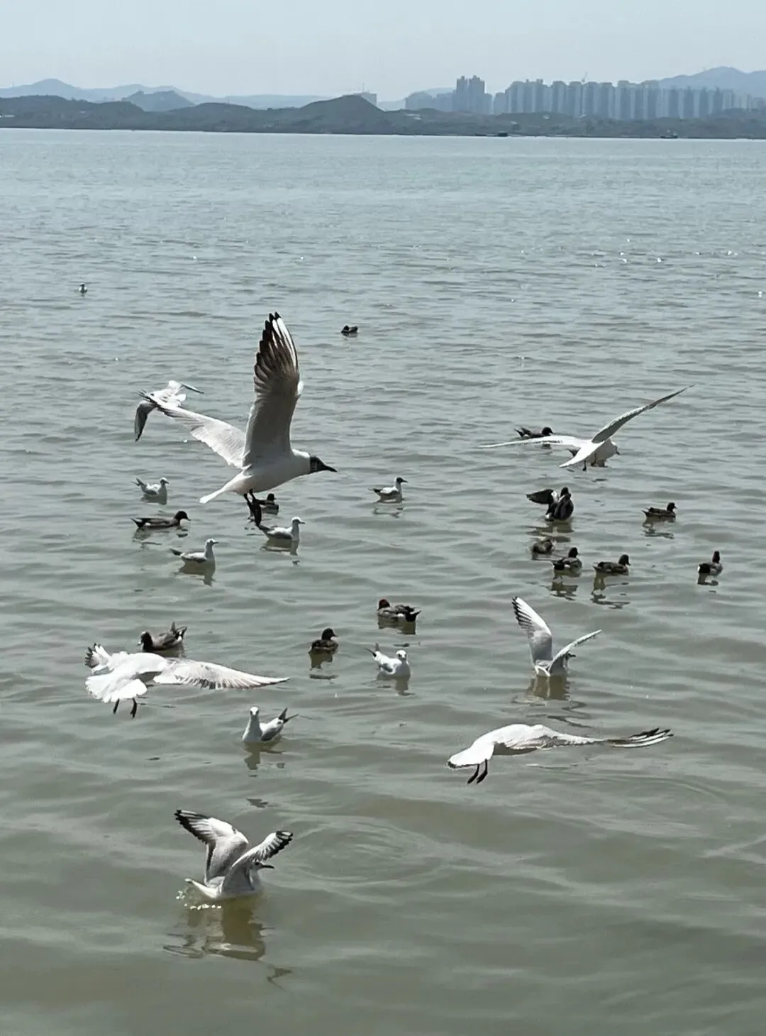 翩翩起舞的海鸥们,一群一群地聚集成堆,有的在空中飞翔,洁白的身躯像是天上的云朵。它们时而高空府冲而下,时而飞旋,鸥鸣声起起落落,仿佛在向我们挥手呢?看海鸥的人们俯仰频频。有人手拿望远镜观鸟,还很多人手举面包,伸展着身子去喂海鸥,更多的人手举相机、手机,怎么都拍不够这海上的生机与灵动。
