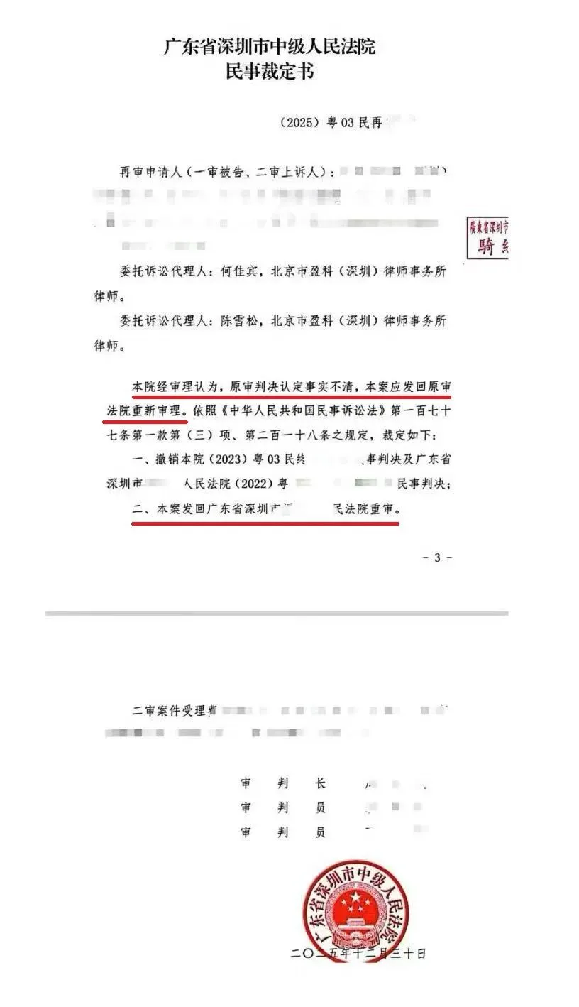 深圳中院再审同时撤销了原一二审判决,发回一审法院重新审理,《民事裁定书》载明理由是: