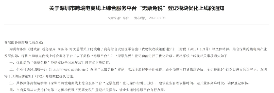 这是深圳市商务局于1月31日发布通知,宣布深圳市跨境电商线上综合服务平台的“无票免税”登记模块已完成优化,并于2026年2月1日正式上线运行。不少卖家也看到这个消息,觉得亚马逊卖家的税务问题终于有解决方案了。可惜呀,这个政策跟大部分亚马逊卖家无关。