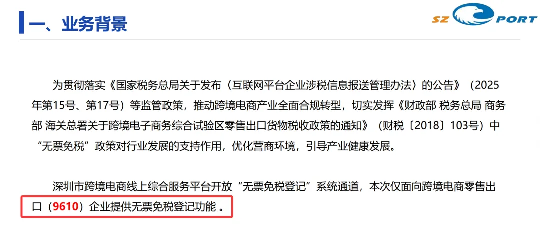 业务背景里强调了:深圳市跨境电商线上综合服务平台开放“无票免税登记”系统通道,本次仅面向跨境电商零售出口(9610)企业提供无票免税登记功能 。