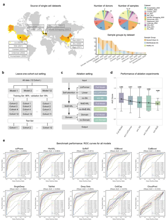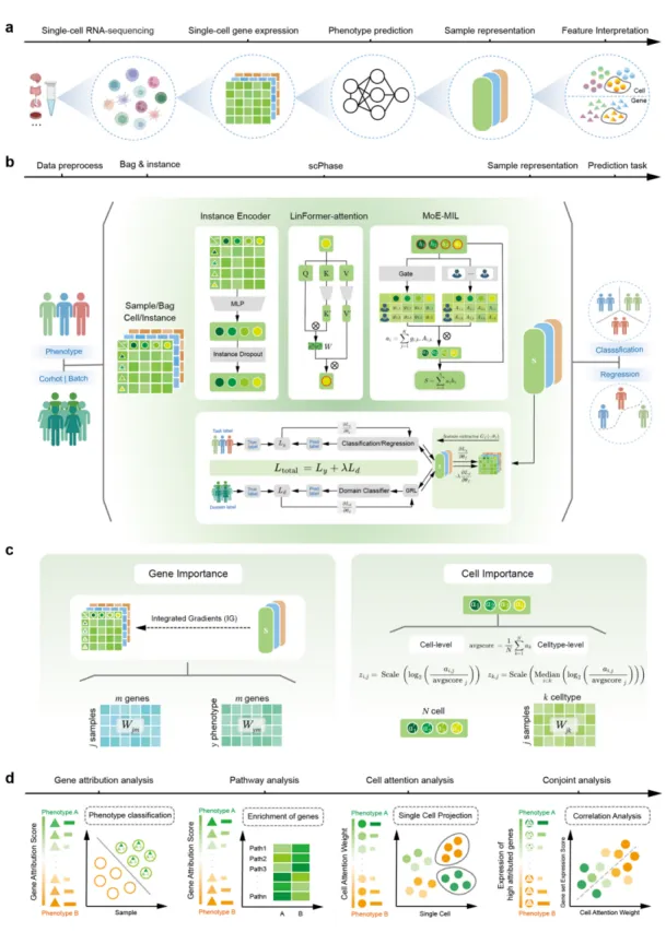 为保障scPhase的实用性与稳定性,研究团队在scPhase中引入三项关键设计:第一,引入LinFormer线性注意力模块,将注意力计算复杂度由平方级降至线性级,使模型能够在数百万细胞规模的数据中高效捕捉样本内部的全局细胞依赖关系;第二,采用基于混合专家的多示例学习聚合模块(MoE-MIL),通过门控注意力机制驱动多个“专家”网络协同工作,动态识别并加权与表型差异最相关的关键细胞,将海量单细胞信息聚合为浓缩且鲁棒的患者级表征;第三,结合对抗式域适应策略,在训练过程中有效减弱跨队列、跨平台带来的批次效应,提升模型在不同数据集上的稳定性与泛化能力。此外,scPhase构建了多层次可解释性分析体系:一方面利用MoE-MIL模块的注意力权重刻画细胞层贡献,另一方面结合积分梯度(Integrated Gradients)评估基因层重要性,并可进一步扩展至通路与调控维度,实现对预测结果的系统溯源,从而在表型预测与机制探索之间建立更紧密的闭环衔接。