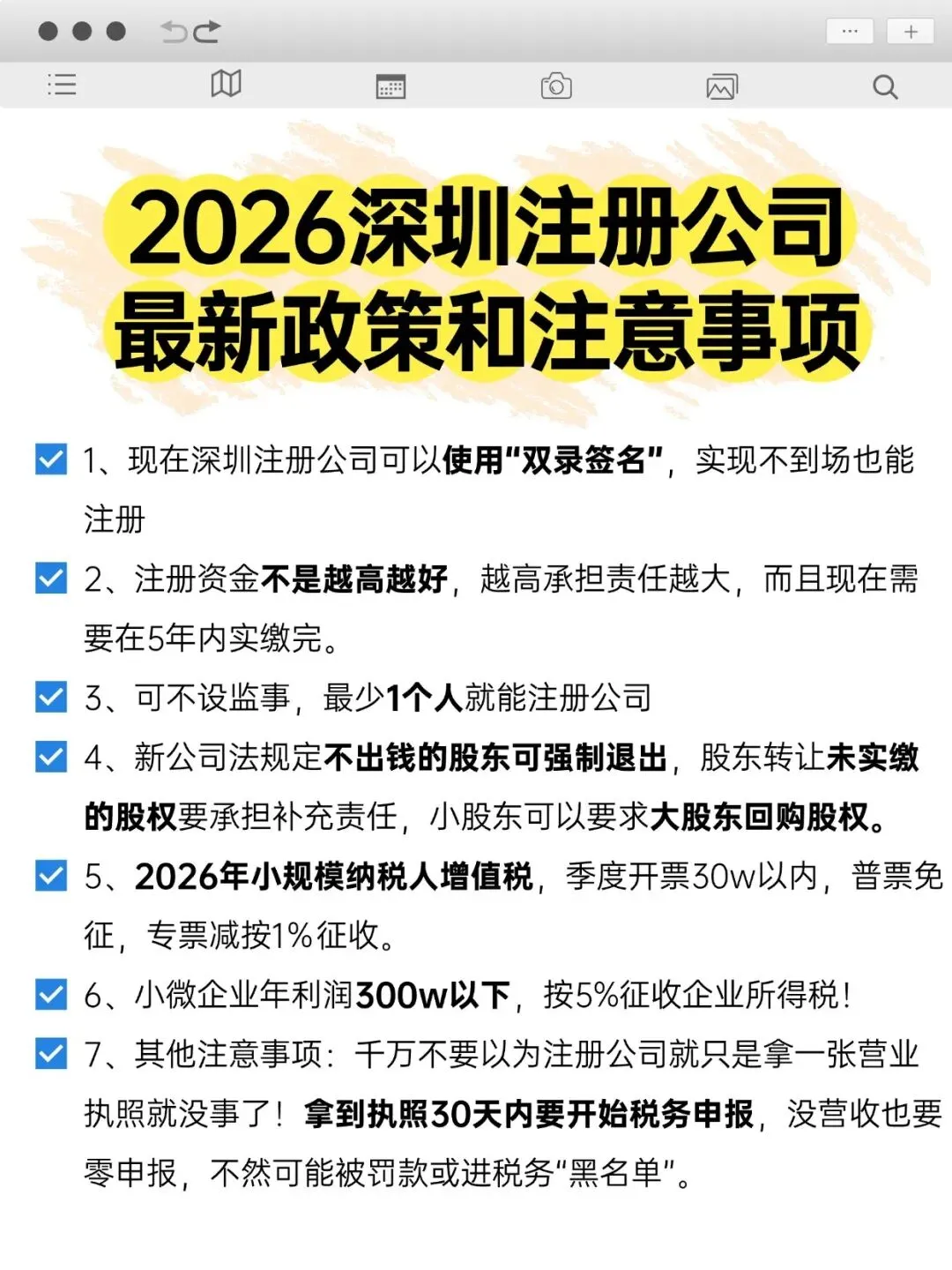 格式:深圳 + 字号 + 行业 + 有限公司 (例:深圳富瑭科技有限公司) 注意:名字里不能有数字、英文,不能跟别人重名,也不能蹭知名商标。建议提前想3-5个备用名,提高通过率。现在是认缴制(但需在5年内实缴完),建议根据实际情况填写,50万-100万是常见区间。这是技术活,别随便抄同行的。注意主营和副营的区分,它直接影响你后期能开什么发票,以及适用什么税收政策。建议参考近期注册的、与你业务高度同行的公司。法人、股东、监事的身份证正反面照片和实名手机号即可。现在深圳支持“双录签名”,线上人脸识别就能完成实名认证,非常方便。 这是很多人的卡点。深圳要求提供25位房屋编码,且地址必须真实有效(能收工商、税务的信函)。如果觉得资料比较多,比较混乱,交给富瑭直接一站式全程代办!免费咨询!
