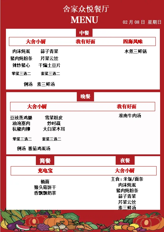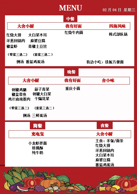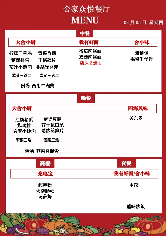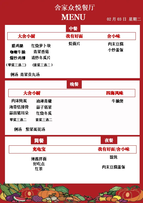 舍弗勒广州路餐厅 每日菜单(02月02日-02月08日)