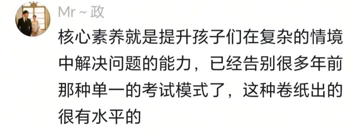也有一些给出正面评价,认可试卷的创新性和引导性,认为这样的命题更贴合当下的教育理念: