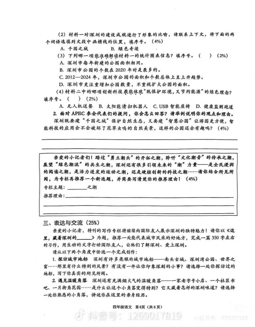 和传统的考法不一样,这份试卷开篇就将考生化身国际小记者,为即将到来的2026年APEC策划一份“深圳特刊”。这种设定并非形式上的花哨,而是让考生在真实、具体的语境中运用语言能力——不再是机械地记忆知识点、简单答题,而是需要先理解任务背景,再结合题干要求构思思路、组织语言,真正实现了“在运用中考察能力”,让语文学习与实际生活紧密衔接。