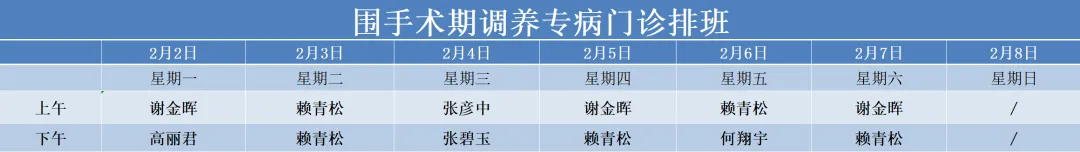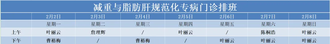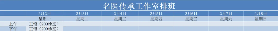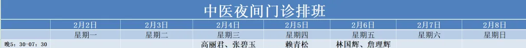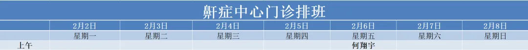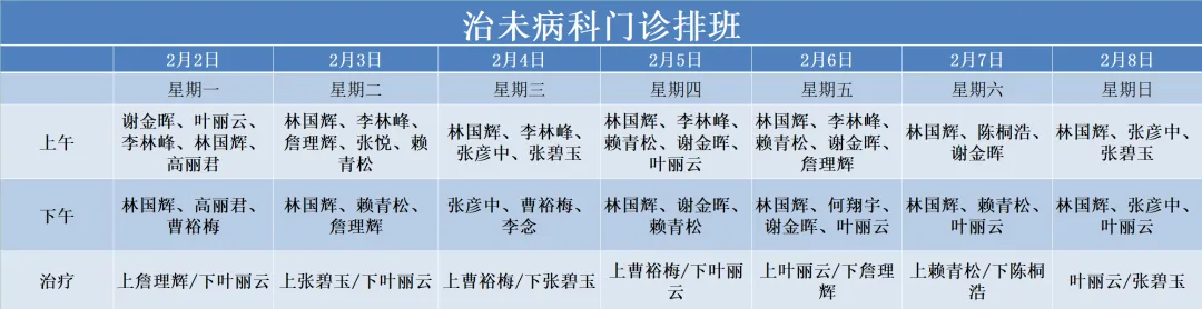 治未病中心02月02号——02月08号门诊医生排班表如下,有需要的朋友可根据时间安排预约。