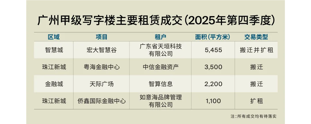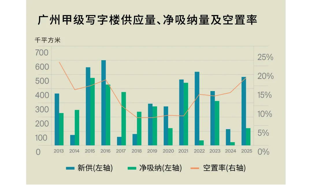 “展望2026年,广州甲级写字楼仍将面临超过140万平方米的新增供给压力。虽然2025年需求有所修复,但供需缺口尚未出现实质性收敛,预计全年空置率仍处上行通道。进入2026年一季度,部分延期项目有望集中交付;这类项目普遍” 经历了半年至一年的预招商,入市初期或能带来一定的净吸纳增量,但在供给体量仍显著偏大的背景下,空置率大概率继续抬升,市场竞争将更依赖“定向让利+条款组合”来实现去化。“
