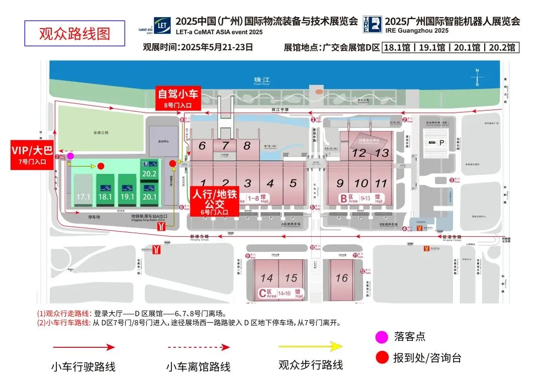 搭乘地铁2号线(广州南站方向),于“昌岗站”换乘8号线(万胜围方向)抵达“新港东站A出口”,步行至D区展馆6号门进入登录大厅。