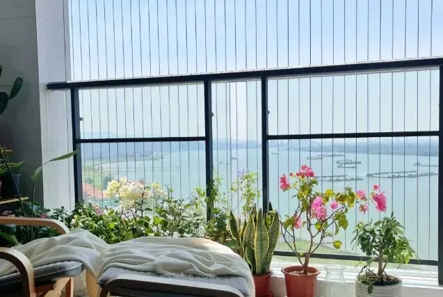 她家阳台那个通透啊,阳光毫无遮挡地洒进客厅,整个空间亮堂得像开了美颜滤镜。我下意识往窗外看,想找她家的防盗窗在哪儿,结果找了半天,才发现窗户上隐隐约约有几根细细的钢丝。