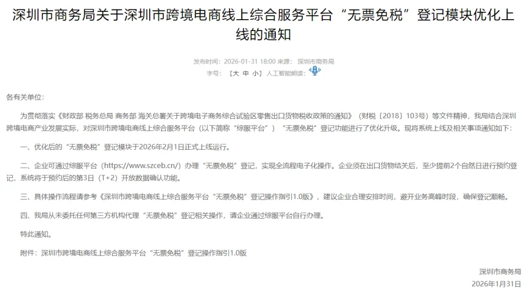 深圳跨境电商卖家看过来:2月1日起,综合服务平台“无票免税”登记上线了
