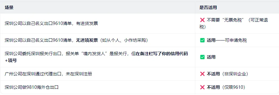 关键点:企业必须是在深圳注册(营业执照地址在深圳)。若采用“委托代理”出口(如货代/报关行代理),实际卖家(即你)也必须是深圳企业,并在报关单/清单中按规范备注你的18位统一社会信用代码及对应商品项号。二、这个备案能免哪些税?