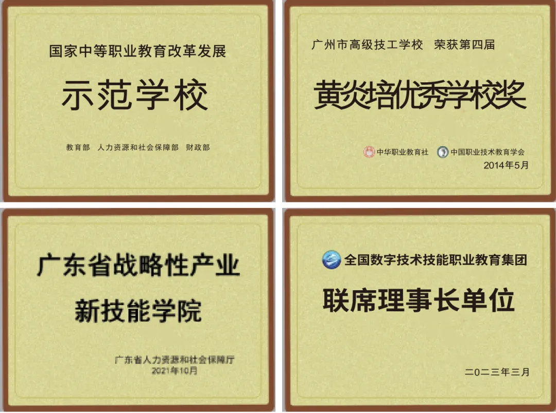 广州市高级技工学校创办于1952年,1996年成为省重点技工学校,2000年成为国家重点技校,2001年晋升为高级技工学校。与广州市农业中等专业学校合并,组成新的广州市高级技工学校,并于同年通过ISO9000国际质量体系认证,被广东省劳动和社会保障厅批准为技师学院,2012年成为国家级示范校、高技能人才培训基地。
