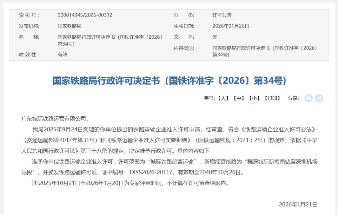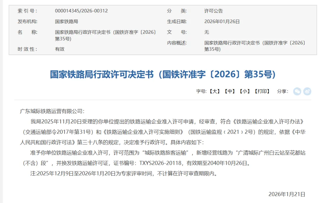 国家铁路局官网近日发布的信息显示,广州地铁集团全资子公司广东城际铁路运营有限公司(以下简称“广东城际运营公司”)获得穗深城际新塘南站至深圳机场站段、广清城际广州白云站至花都站(不含)段的运输许可证,标志着广东自主运营城际铁路的范围进一步扩大。