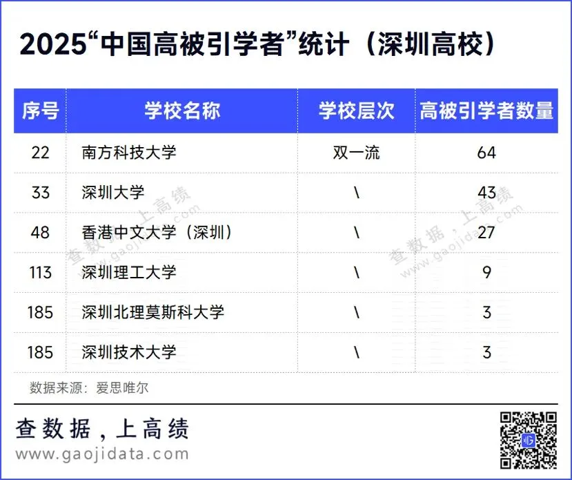 ● 2025“中国高被引学者”榜单发布,深圳6所高校上榜。