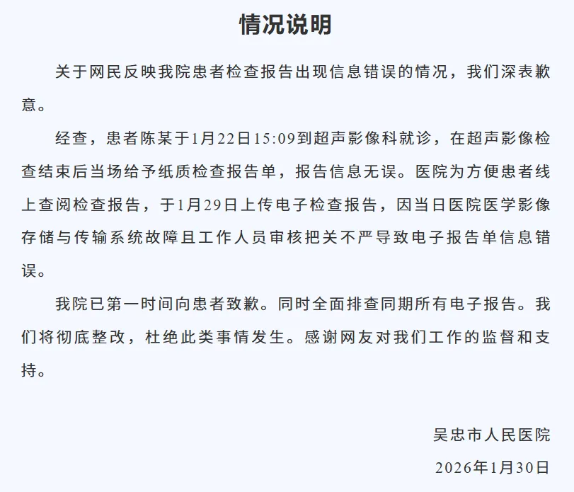 ● 1月30日,宁夏吴忠市人民医院通报“73岁男子被检出宫内早孕”:纸质检查报告单信息无误,因当日系统故障且工作人员审核把关不严致电子报告单信息错误。详情>>