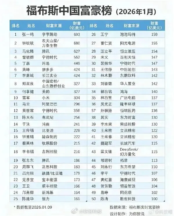 ● 中国最新富豪榜出炉:张一鸣、钟睒睒、马化腾稳居前三,雷军排名第十。