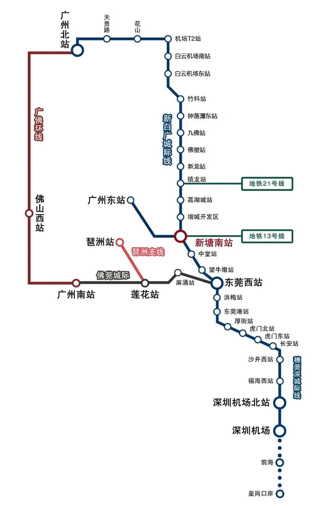 🚇新白广城际全长约78公里,线路📍起点为新塘站,向北经增城经济技术开发区、中新广州知识城、广州白云机场至📍终点广州北站。