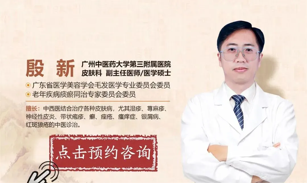 先和大家简单介绍下殷新医生,让街坊们挂号更有底气!殷新医师是广州中医药大学第三附属医院皮肤科副主任医师,临床医学硕士,从事皮肤性病临床、科研及教学工作多年,擅长中西医结合治疗湿疹、荨麻疹、痤疮、银屑病等各类皮肤病。目前殷新主任主要在广州中医药大学第三附属医院坐诊,同时也会在广州宏韵中医门诊部多点执业,患者可根据自身位置选择就诊地点。