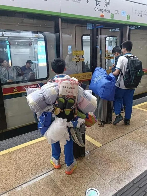 没有精致滤镜修饰,没有刻意摆拍痕迹,画面中仅有一名身着蓝白校服的清瘦少年,安静伫立在候车队伍中。他的身形不算高大,甚至略显单薄,肩头却承载着一座“行李小山”——被褥、蚊帐、运动鞋层层叠放,用红绳捆扎得严丝合缝,侧面悬挂着鼓鼓囊囊的物件,右手还拖拽着满满一箱杂物,行李堆中甚至探出一只“大湾鸡”玩偶,活脱脱一个移动的“小家当”。