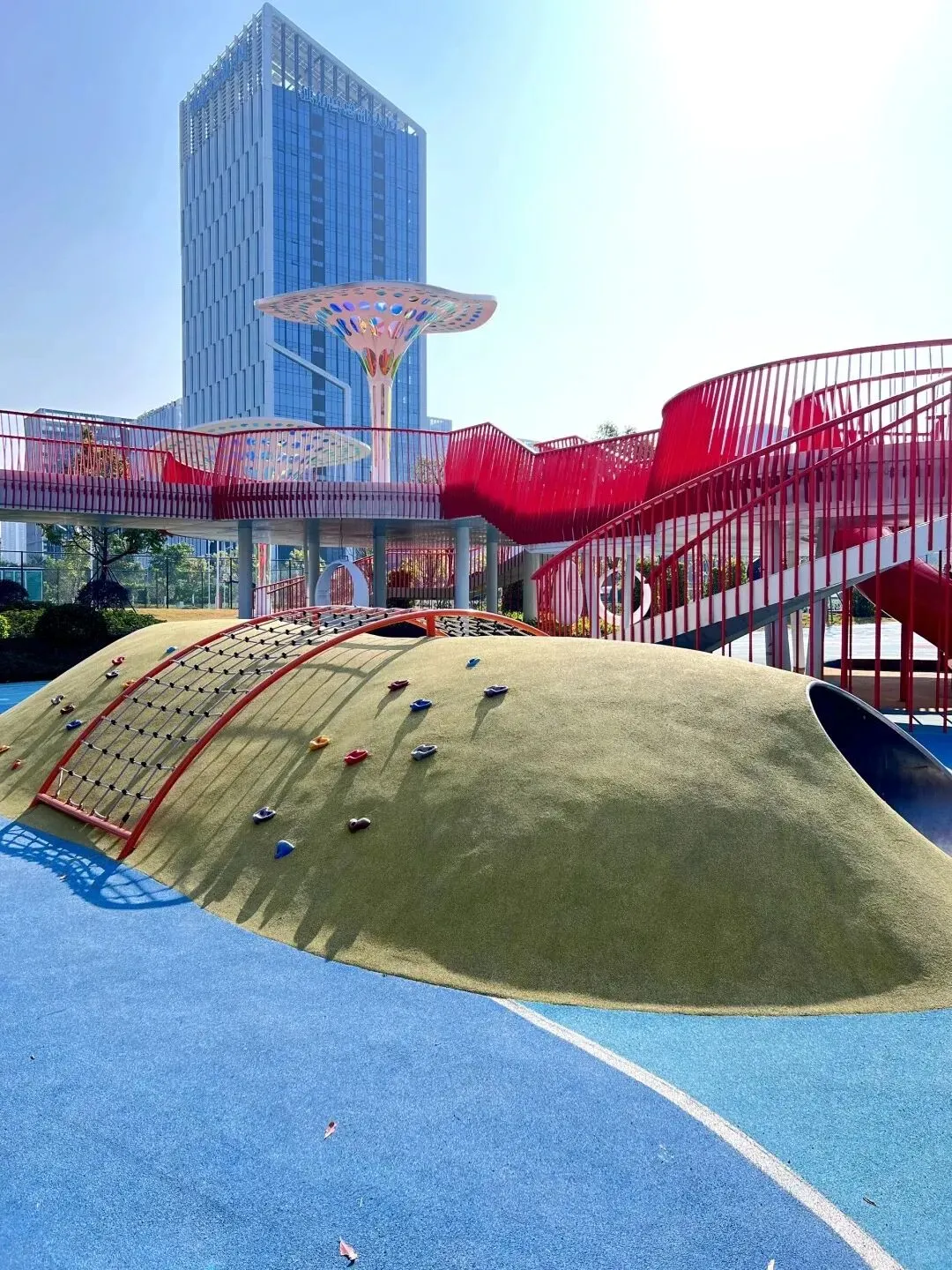 ✅ 全龄友好设施太贴心!攀岩墙分了3档难度,我家2岁的娃也能试着爬最低难度的,完全不费妈;还有软乎乎的月亮秋千,大人小孩都能坐,荡起来的时候能看到整片蓝天,娃说自己像在飞。绿植间还藏着传声筒、学步墙,娃边玩边互动,我也能趁机歇口气。