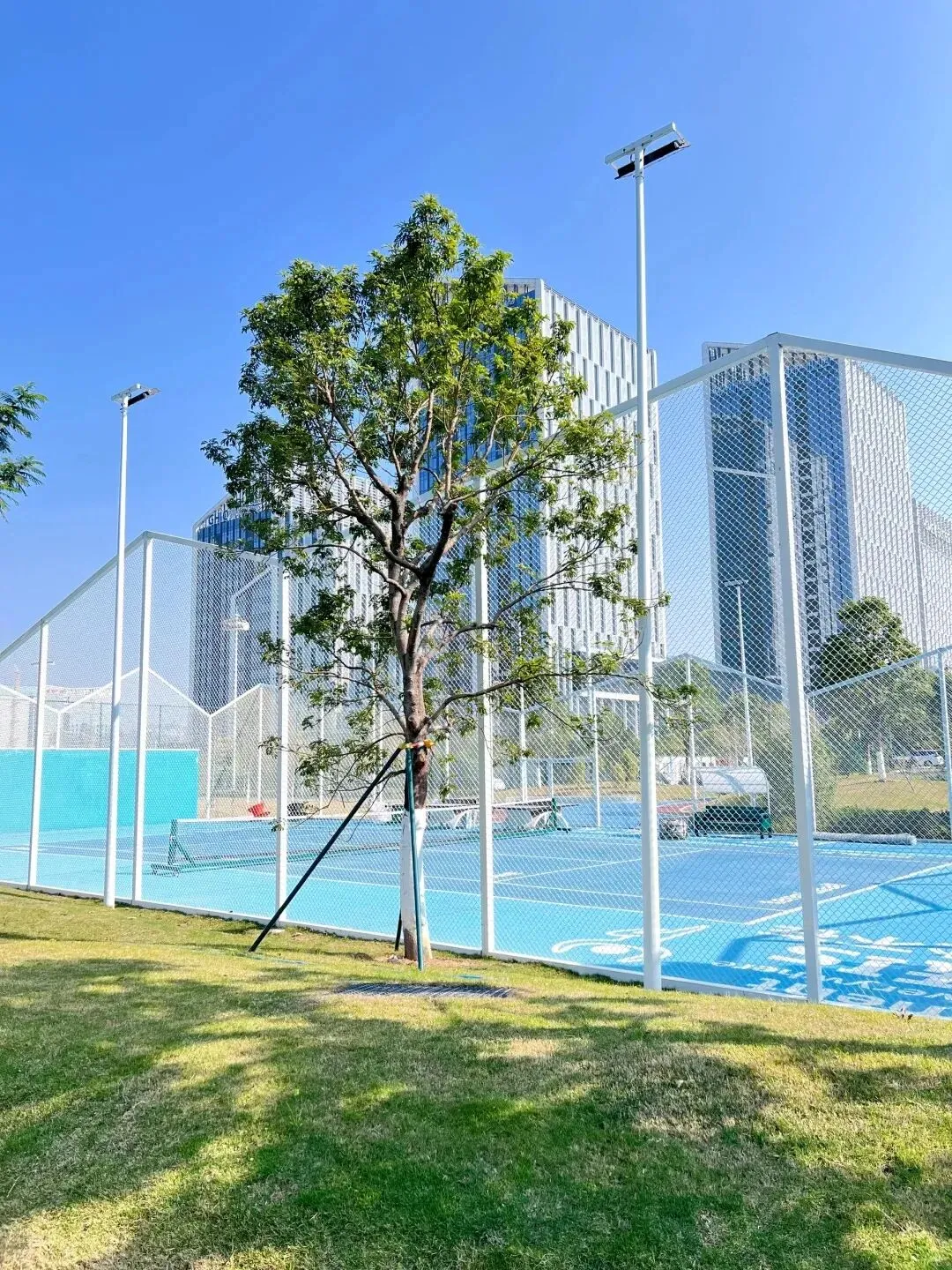 长辈可以去乒乓球场打球,我老公约了朋友想踢足球(提醒一下,11人制足球场需要提前预约),累了就坐在太阳能充电椅上歇脚,还能给手机补电,简直是为长辈量身定做的。一家三代各玩各的,互不打扰,氛围特别好。