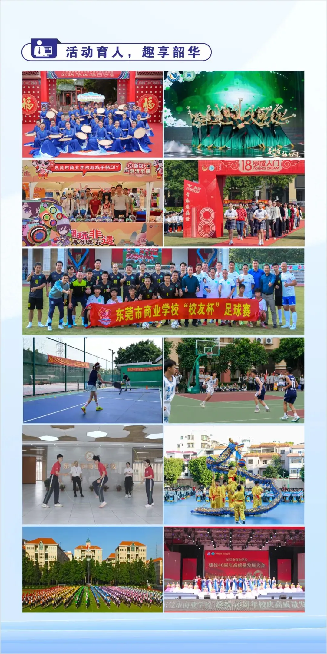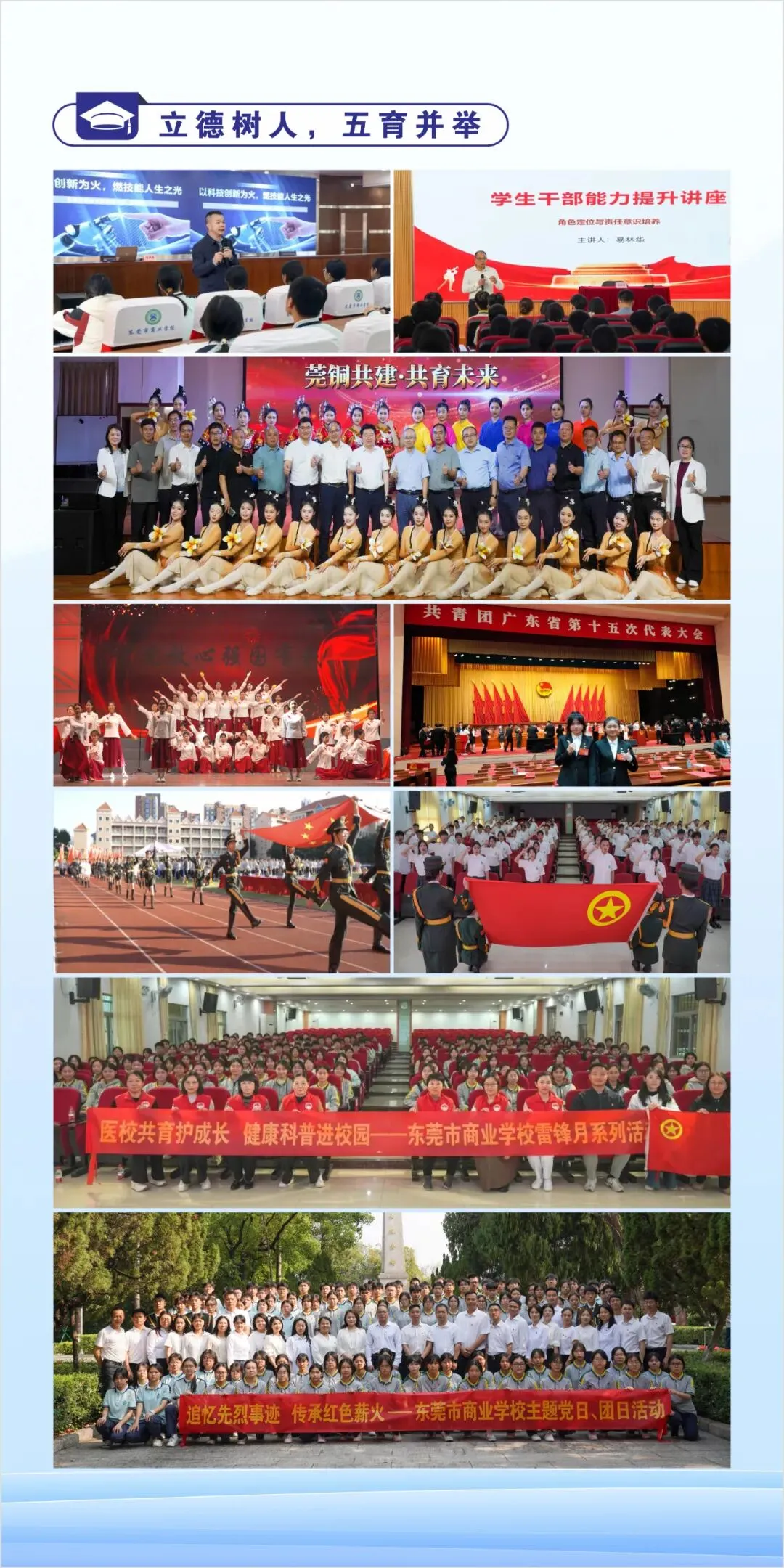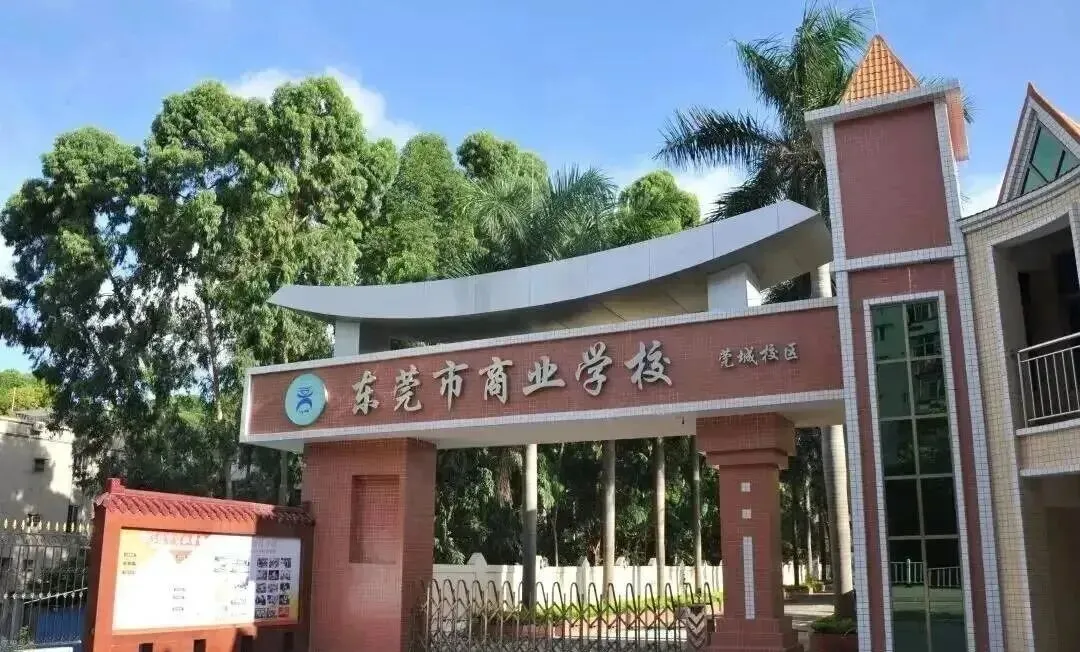 东莞市商业学校 1984 年创办(原名附城职中),市直属公办中职,“一校两牌”(挂东莞市幼儿师范学校),首批国家级重点中职、省高水平中职建设单位,东城 + 莞城两校区占地 209 亩,在校生 5400 余人。设 17 个专业,动漫与游戏制作、电子商务为省高水平专业群,幼儿保育、会计事务等为骨干,“双师型” 教师阵容强。与多家企业共建工作室,订单培养,近三年就业率 100%,多专业开通 “三二分段”,师生获国省级奖千余项,符合条件学生享国家免学费政策。