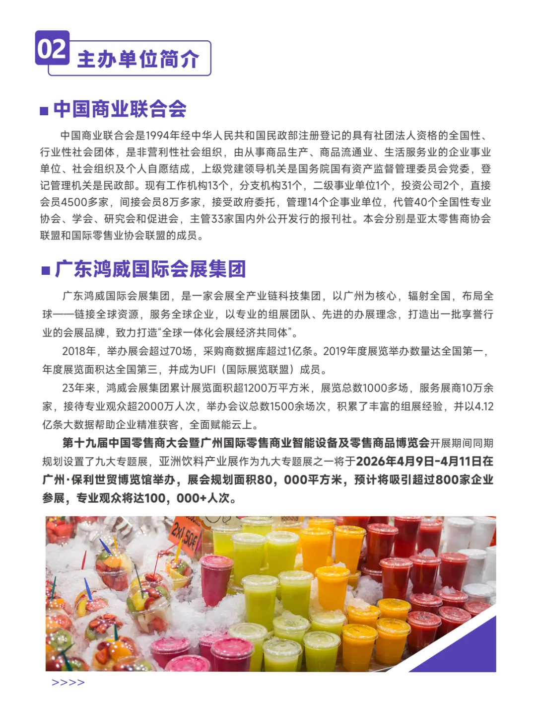 第十九届中国零售商大会暨广州国际零售商业智能设备及零售商品博览会开展期间同期规划设置了九大专题展,亚洲饮料产业展作为九大专题展之一将于2026年4月9日-4月11日在广州·保利世贸博览馆举办,展会规划面积80,000平方米,预计将吸引超过800家企业参展,专业观众将达100,000+人次。